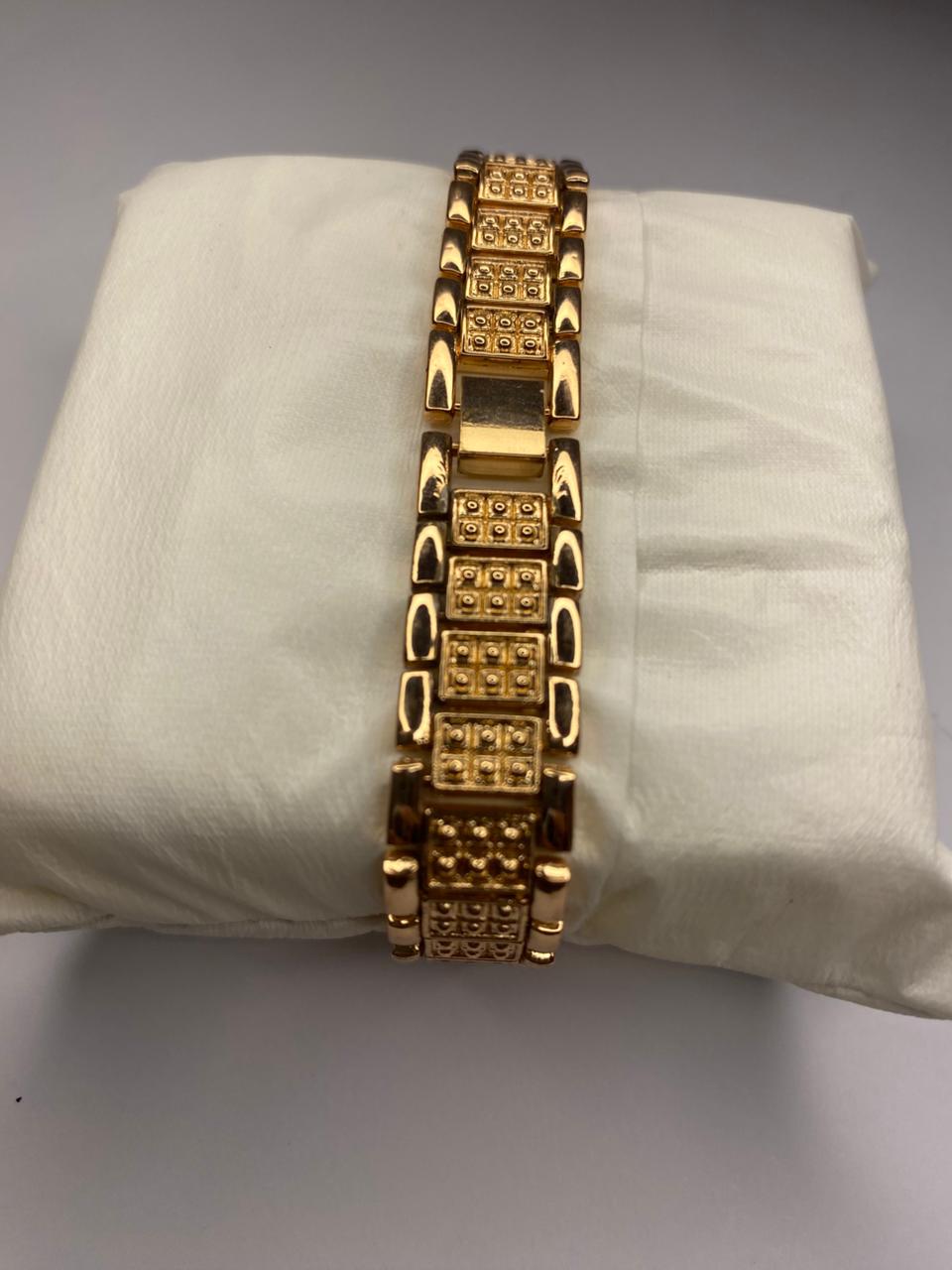 Why settle for ordinary when you can sparkle? This stunning watch features a radiant gold-tone finish that exudes luxury. What truly sets it apart is the full pavé setting of brilliant rhinestones, not only on the bezel but continuing down the entire length of the bracelet link strap. This continuous shimmer creates a dazzling effect that commands attention.