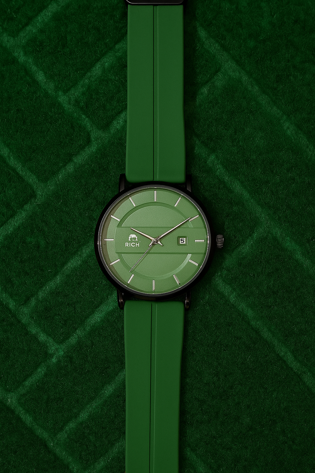 Redefine Your Casual Style. Break away from the ordinary with this striking timepiece that combines modern aesthetics with everyday functionality. The watch features a vibrant, matte green finish that demands attention, paired with a sleek black case for a masculine, sporty edge. The textured dial adds depth, while the integrated date window ensures you stay on schedule. With a soft, flexible silicone strap, it offers superior comfort for all-day wear, whether you’re at the gym, the office, or hanging out with friends.